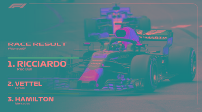 5月27日晚,2018年F1摩纳哥站正式比赛结束。在一场一停的保胎大战中,红牛车队里卡多从杆位发车,一路领 先夺冠;法拉利车队维特尔亚军,梅赛德斯车队汉密尔顿季军。