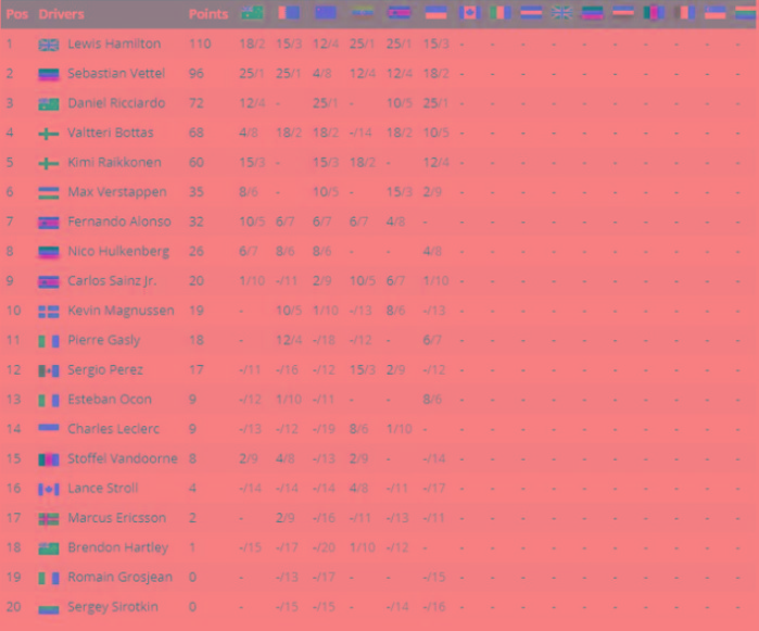 以下为F1摩纳哥站后车手积分榜: