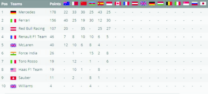 以下为F1摩纳哥站后车队积分榜: