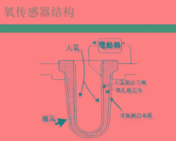 1..氧化锆(ZrO2)为固态电解质的一种,它有一种特性就是在高温时氧离子易于移动。此型氧传感器将氧化锆烧结成管状,并与内层与外层涂上白金(Pt),这就是氧化触媒的作用,当氧离子移动时即会产生电动势,而电动势的大小是依氧化锆两侧的白金所接触到的氧而定,最外层则覆盖一层保护壳。