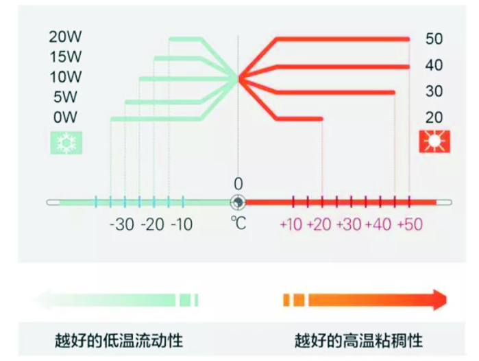 蓝色代表低温性能,红色代表高温性能。举个例子,5W-30,它的最低使用环境温度达到零下30度,最高的使用环境温度可以达到零上30度。